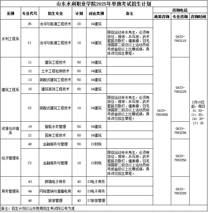 学校立足“水利特色、工科优势”专业定位,精准对接战略性资源保障水利基础产业、山东省十强产业和日照市临港产业,开设水利、交通运输、土木建筑、资源环境与安全、装备制造、电子与信息、财经商贸、旅游、文化艺术9个专业大类47个高职专科专业和8个“3+2”专本贯通分段培养试点专业。学校拥有骨干专业5个、现代学徒制试点专业2个、全国水利优质专业3个、山东省品牌专业群2个、山东省高水平专业群3个、山东省特色专业8个。建成专业教学资源库1个、在线精品课程7门、课程思政示范课程1门、山东省在线精品课程19门、山东省精品资源共享课程27门、山东省课程思政示范课程6门。入选“十四五”职业教育国家规划教材9部、山东省规划教材13部。荣获省级教学成果奖一等奖8项。
